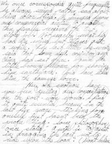 Hey old snotnose, have you been putting deep concentration on the post-war world. I find it quite essential, because in the last five years---thinking for oneself just hasn’t been the proper thing. Some philosopher once stated, “A wife is to assist in dragging the cart, not to ride upon the load.” (Don’t believe you use the quotation marks are used unless the sentence is verbatim. It isn’t quite.) Your a business gal and I’m practically a poor country cold; therefore assistance and guidance will be sincerely needed. In return for your mental push, I will move your furniture, eat your experiments, keep you warm in bed, and arouse you gently in the morn. Tis a fair bargain me proud and lovely lass, so keep it in mind.